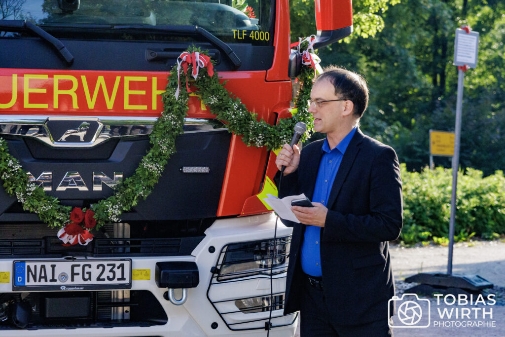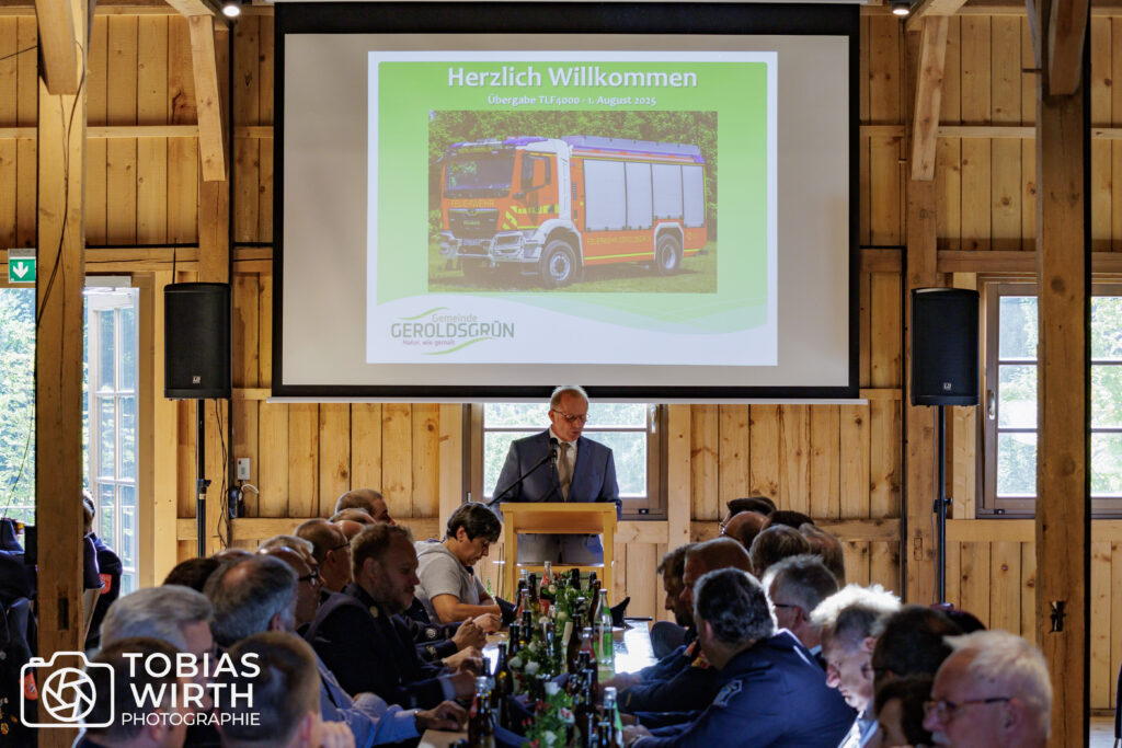 Hierzu hatte Bürgermeister Stefan Münch zu einer Feierstunde in die Bürgerscheune in Geroldsgrün eingeladen. In seiner Ansprache erläuterte Münch die Notwendigkeit, einen adäquaten Ersatz für das mittlerweile 37 Jahre alte TLF 16/25 zu beschaffen. Nach Abwägung der verfügbaren Normfahrzeuge entschied sich Feuerwehrführung und Gemeinderat im Jahr 2020 für ein TLF4000. Verzögert durch den Corona bedingten Lockdown und Amtswechsel im Bürgermeister- und Kommandantenamt, und nachdem auch die Regierung von Oberfranken der Beschaffung zustimmte, wurde das Fahrzeug schließlich 2023 europaweit ausgeschrieben. Den Auftrag erhielt die Firma Rosenbauer in Leonding (Österreich). Nach fast 2-jähriger Bauzeit konnte das Fahrzeug im Juni 2025 beim Hersteller abgeholt werden.